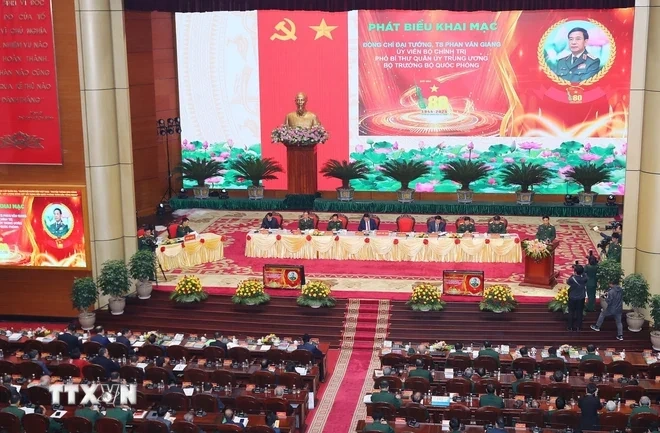 Thượng tướng Trịnh Văn Quyết, Bí thư Trung ương Đảng, Ủy viên Thường vụ Quân ủy Trung ương, Chủ nhiệm Tổng Cục chính trị Quân đội nhân dân Việt Nam phát biểu tham luận. (Ảnh: Lâm Khánh/TTXVN)