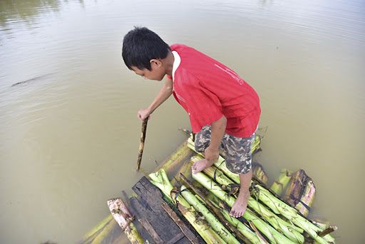 Quê tôi là vùng chiêm trũng nên cứ mưa bão là nước lâu rút. Chúng tôi đi học, mẹ tôi đi dạy, đi chợ bằng bè chuối. Đứng trước nhà mắt mẹ ngân ngấn nước, thương cây cối, thương hạt lúa mới đỏ đuôi chưa kịp gặt về. Biết bao mồ hôi công sức cần mẫn tháng ngày, mấy hôm trước còn nguyên vẹn bây giờ đã trắng tay.