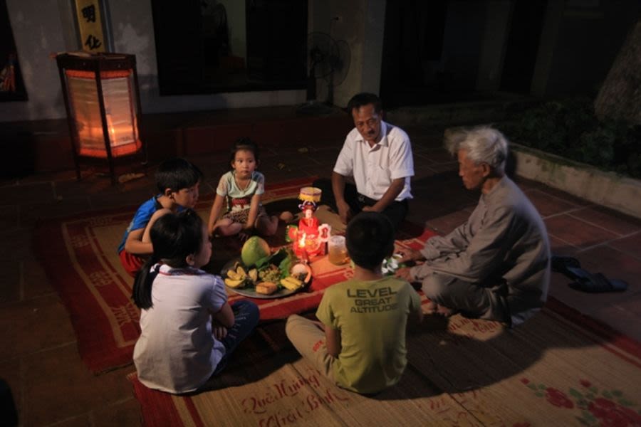 Trở về nhà, mẹ bảo tôi trải chiếc chiếu cói ra giữa sân và hạ lễ trên bàn thờ xuống. Gọi là lễ nhưng cũng rất đơn giản, một nải chuối tiêu và mấy quả hồng, quả bưởi, quả na. Đặc biệt nhất là đĩa xôi lạc thơm bùi. Cả nhà phá cỗ thật vui. Càng về khuya trăng càng sáng. Trăng dát vàng loang loáng trên những tàu lá chuối sau vườn, trăng ướt đẫm sương đêm. Tôi nằm vắt chân chữ ngũ, ngửa mặt lên trời mơ màng ngắm nhìn trăng rồi tưởng tượng vầng trăng trên cao kia là cung Hằng, ngôi nhà của một nàng tiên mang tên Hằng Nga. Những đêm trăng sáng nhất trong năm, nàng diện bộ xiêm y lộng lẫy, nhìn xuống trần gian mỉm cười để đáp lại nỗi mong chờ của lũ trẻ con.