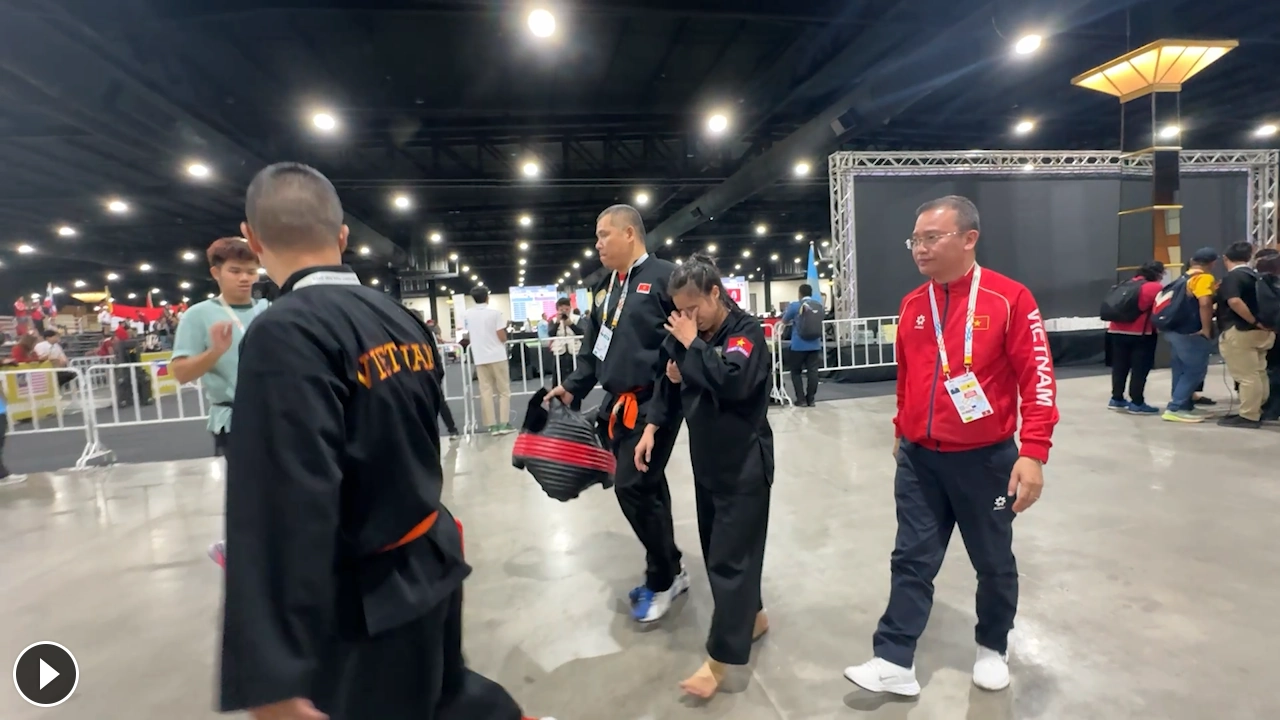 Không được nhận sự can thiệp của nhân viên y tế, thành viên ban huấn luyện Pencak Silat Việt Nam sau khi tự ý vào thảm hỗ trợ Hải Quyên đã phải nhận thẻ cảnh cáo từ trọng tài.
