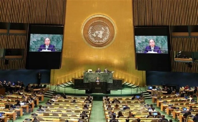Thủ tướng khẳng định Việt Nam ủng hộ mạnh mẽ vai trò trung tâm của Liên hợp quốc trong hệ thống quốc tế đa phương và tích cực đóng góp thực hiện các trụ cột hợp tác cơ bản của Liên hợp quốc về duy trì hòa bình, an ninh quốc tế, hợp tác phát triển và bảo đảm quyền con người.