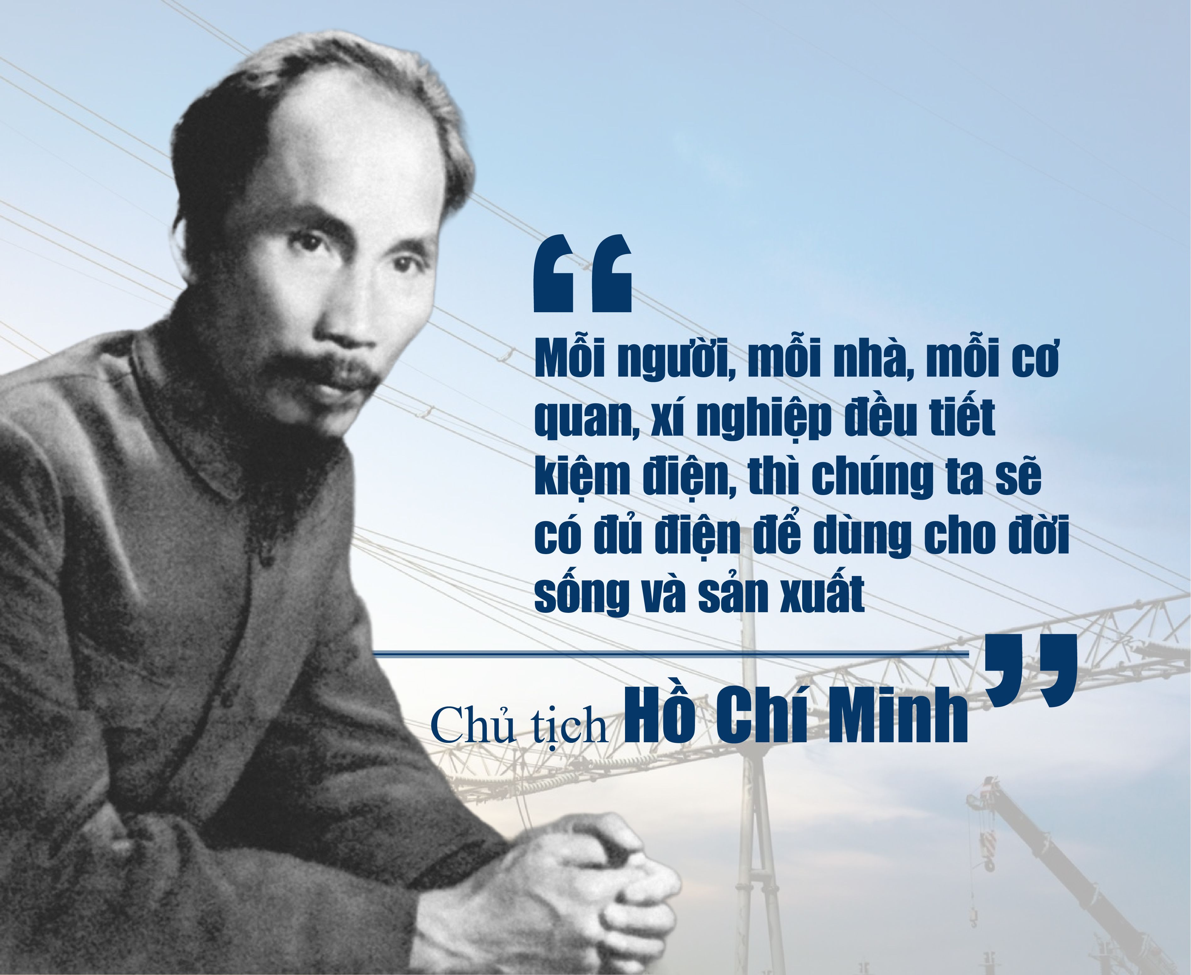 Chủ tịch Hồ Chí Minh là tấm gương sáng ngời về tinh thần tiết kiệm và thực hành tiết kiệm. Bản thân Người luôn thực hành tiết kiệm điện từ những việc làm nhỏ nhất và nhất là từ lối sống vô cùng giản dị. Người cho rằng “tiết kiệm là không xa xỉ, không hoang phí, không bừa bãi”; và chữ “kiệm” trong Tư tưởng Hồ Chí Minh cũng mang nội hàm rộng, bao gồm tiết kiệm của cải vật chất, tiết kiệm sức dân, tiết kiệm thời gian... Người từng nhiều lần nhắc nhở về việc tiết kiệm điện, đặc biệt là trong bối cảnh nước ta còn nghèo, lại vừa kháng chiến vừa kiến quốc, đó là “mỗi người, mỗi nhà, mỗi cơ quan, xí nghiệp đều tiết kiệm điện, thì chúng ta sẽ có đủ điện để dùng cho đời sống và sản xuất”.