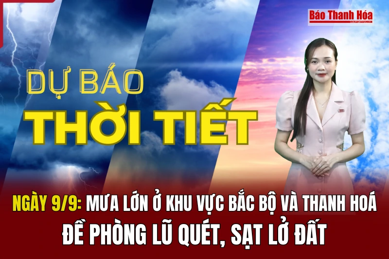 (Baothanhhoa.vn) - Theo dự báo của Trung tâm Khí tượng Thuỷ văn Quốc gia, hôm nay 9/9, phía Đông Bắc Bộ và Thanh Hóa, có mưa, mưa vừa, cục bộ có nơi mưa to và dông với lượng mưa phổ biến 15-30mm, có nơi trên 60mm; riêng vùng núi và trung du có mưa vừa, mưa to, cục bộ có nơi mưa rất to và dông với lượng mưa phổ biến 40-80mm, cục bộ có nơi trên 150mm.