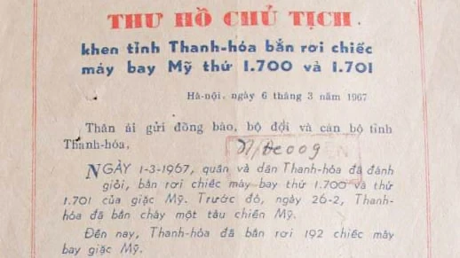 (Baothanhhoa.vn) - Không chỉ nhiều lần về thăm và dành tình cảm đặc biệt cho Thanh Hóa, Bác Hồ còn có nhiều kỷ vật thiêng liêng tặng đất và người xứ Thanh, trong đó có 4 bức thư Người gửi cho Thanh Hóa, hiện đang được lưu giữ tại Bảo tàng tỉnh. Trong 4 bức thư Người gửi cho Thanh Hóa, bức thư thứ 3, vào ngày 7-3-1967 được đăng trên trang nhất Báo Quân đội nhân dân số 2083 với nội dung “Thư Hồ Chủ tịch gửi thư khen quân và dân Thanh Hóa".