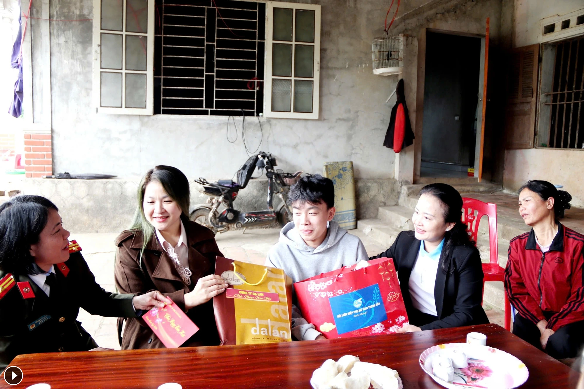 Chủ tịch Hội LHPN tỉnh Lương Thị Hạnh; Mẹ đỡ đầu Nguyễn Thị Hồng Liên và các đơn vị đồng hành tặng quà, động viên cháu Nguyễn Tấn Tài tại nhà riêng.